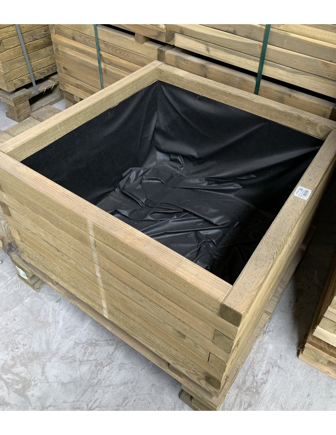 Se serveix amb un folre geotèxtil interior per evitar la sortida de la terra entre les fustes al regar.